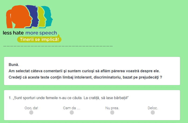 Conferința s-a organizat într-un format inedit la Colegiul Național Bilingv George Coșbuc, cu participarea mai multor elevi invitați. ÃŽn cadrul conferinței am oferit un preview asupra unor activități care vor fi dezvoltate în proiect. Cu ajutorul unor tablete, tinerii au completat un quizz online. Am selectat câteva comentarii de pe gsp.ro. Tinerii au fost întrebați daca și în ce măsură acele comentarii conțin limbaj intolerant, discriminatoriu, bazat pe prejudecăți. Rezultatele au fost prezentate live sub formă de grafice la sfârșitul evenimentului.